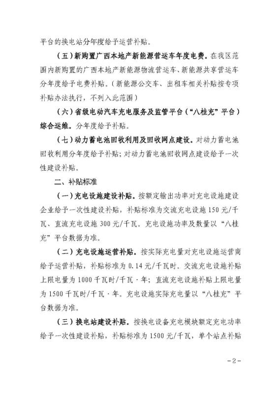 (一)充電設(shè)施建設(shè)補(bǔ)貼。按額定輸出功率對充電設(shè)施建設(shè)企業(yè)給予一次性建設(shè)補(bǔ)貼,補(bǔ)貼標(biāo)準(zhǔn)為交流充電設(shè)施150元/千瓦、直流充電設(shè)施300元/千瓦。充電設(shè)施功率及數(shù)量以“八桂充”平臺(tái)數(shù)據(jù)為準(zhǔn)。
