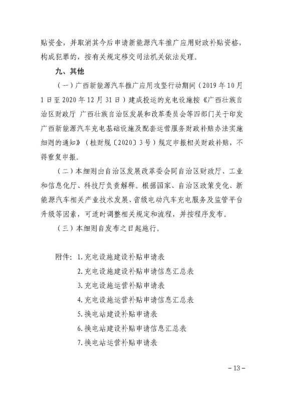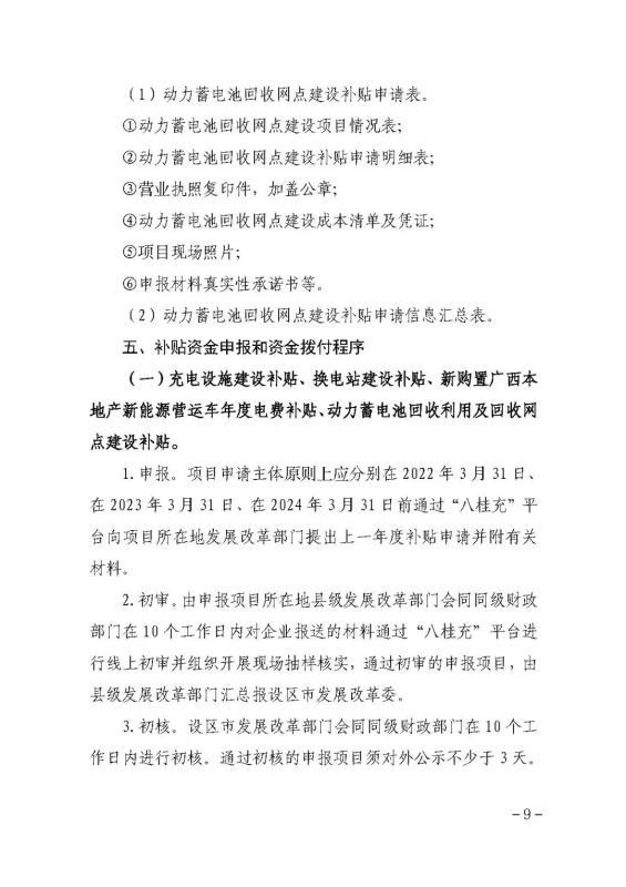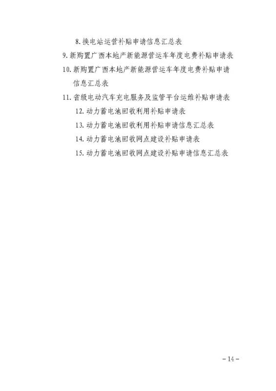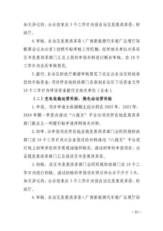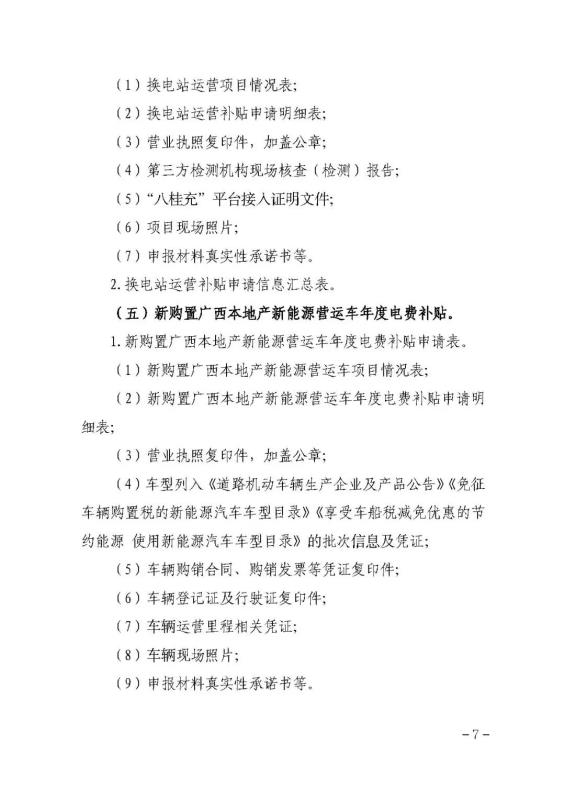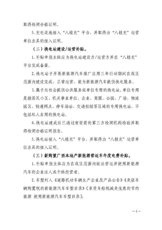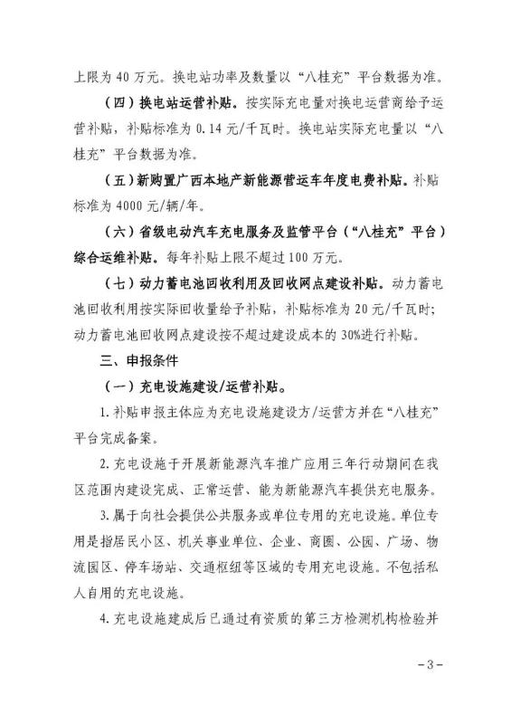 (四)換電站運(yùn)營補(bǔ)貼。按實(shí)際充電量對換電運(yùn)營商給予運(yùn)營補(bǔ)貼,補(bǔ)貼標(biāo)準(zhǔn)為0.14元/千瓦時(shí)。換電站實(shí)際充電量以“八桂充”平臺(tái)數(shù)據(jù)為準(zhǔn)。