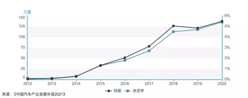 據(jù)工信部2021年中國(guó)汽車(chē)產(chǎn)業(yè)發(fā)展年報(bào)統(tǒng)計(jì)顯示,我國(guó)新能源汽車(chē)銷(xiāo)量和市場(chǎng)滲透率呈高速增長(zhǎng)趨勢(shì),截至2020年銷(xiāo)量連續(xù)六年位居全國(guó)第一[13]。