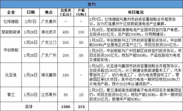 高工鋰電統(tǒng)計顯示,春節(jié)前后,涉及動力及儲能電池開工的項目達(dá)9個,總投資超798億元,產(chǎn)能規(guī)劃超176GWh;簽約投資動力電池項目6個,總投資超1080億元,產(chǎn)能規(guī)劃超215GWh。