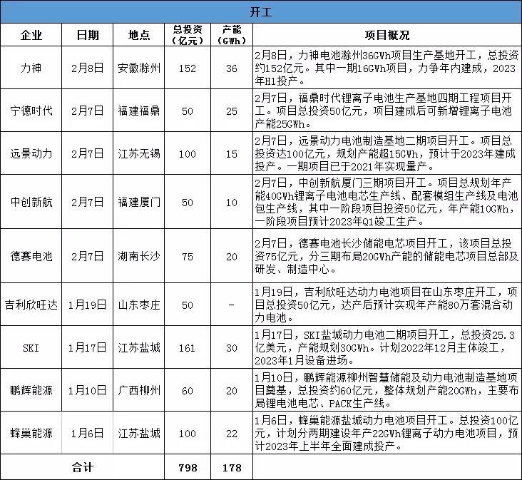 巨大的產(chǎn)能交付疊加確定性市場訂單驅(qū)動下,頭部動力電池企業(yè)擴(kuò)產(chǎn)項目消息頻傳,包括寧德時代、中創(chuàng)新航、遠(yuǎn)景動力、力神、吉利欣旺達(dá)、SKI、鵬輝能源等動力電池企業(yè)在新年伊始紛紛宣布開工。