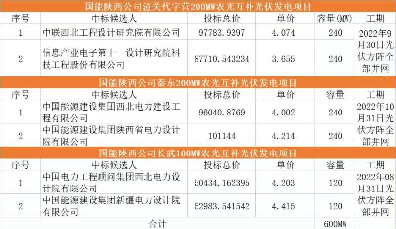 中國(guó)儲(chǔ)能網(wǎng)訊:2月11日,國(guó)能陜西公司潼關(guān)代字營(yíng)200MW農(nóng)光互補(bǔ)光伏發(fā)電項(xiàng)目、國(guó)能陜西公司秦東200MW農(nóng)光互補(bǔ)光伏發(fā)電項(xiàng)目、國(guó)能陜西公司長(zhǎng)武100MW農(nóng)光互補(bǔ)光伏發(fā)電項(xiàng)目公示了EPC中標(biāo)候選人。