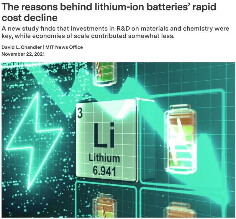 中國儲能網(wǎng)訊:麻省理工學(xué)院學(xué)者在《能源與環(huán)境科學(xué)》雜志發(fā)表論文,指出鋰離子電池是輕量化動力的奇跡,使當(dāng)今的手持電子產(chǎn)品和電動汽車時代成為可能。自30年前推出以來,鋰離子電池的成本大幅下降,降幅與太陽能電池板成本的下降速度相似。那么,是什么因素導(dǎo)致了如此驚人的成本下降,達(dá)到97%?