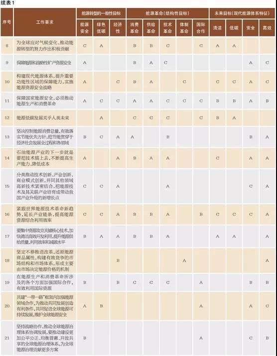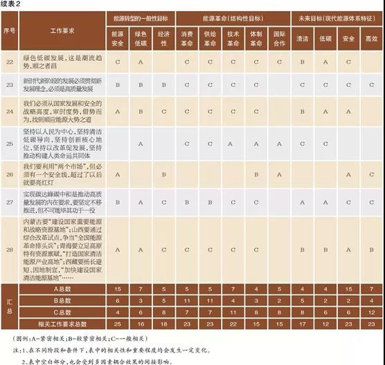中國儲(chǔ)能網(wǎng)訊:1月7日,《人民日?qǐng)?bào)》發(fā)表署名文章《能源的飯碗必須端在自己手里——論推動(dòng)新時(shí)代中國能源高質(zhì)量發(fā)展》,系統(tǒng)梳理了近年來黨中央關(guān)于能源安全、傳統(tǒng)能源和新能源發(fā)展、能耗“雙控”、能源技術(shù)創(chuàng)新和能源國際合作等多方面的工作要求(可總結(jié)為28條要求)。為了深入理解這28項(xiàng)工作要求對(duì)我國能源發(fā)展的具體指導(dǎo)方向與工作側(cè)重點(diǎn),筆者從能源轉(zhuǎn)型目標(biāo)、能源革命和能源未來目標(biāo)三個(gè)方面對(duì)上述工作要求進(jìn)行梳理與分析,并以相關(guān)性緊密程度形式呈現(xiàn)(見表,其中A表示緊密相關(guān),B表示較緊密相關(guān),C表示一般相關(guān))。其中,能源轉(zhuǎn)型目標(biāo)指出了現(xiàn)階段我國能源發(fā)展最應(yīng)重視的方面與問題;能源革命指出了我國能源發(fā)展應(yīng)采取的戰(zhàn)略路徑與重要措施;能源未來目標(biāo)體現(xiàn)的是新時(shí)代我國新型能源體系應(yīng)具備的特征。值得重視的是,我國在踐行“能源的飯碗必須端在自己手里”的進(jìn)程中,需要堅(jiān)持系統(tǒng)觀念并與時(shí)俱進(jìn),在處理多重關(guān)系的過程中,確保能源轉(zhuǎn)型適應(yīng)經(jīng)濟(jì)社會(huì)發(fā)展需要,確保轉(zhuǎn)型進(jìn)程中的能源安全。