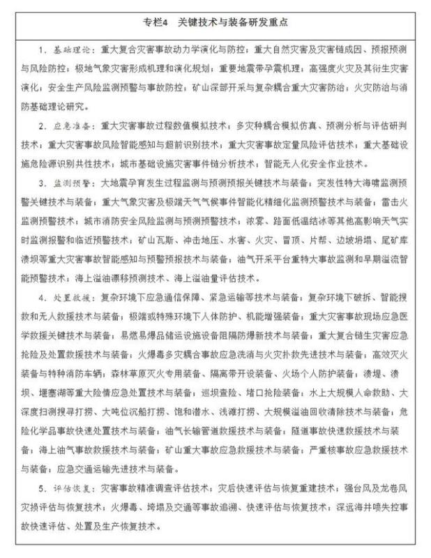 深化應(yīng)用基礎(chǔ)研究。聚焦災(zāi)害事故防控基礎(chǔ)問(wèn)題,強(qiáng)化多學(xué)科交叉理論研究。開(kāi)展重大自然災(zāi)害科學(xué)考察與調(diào)查。整合利用中央和地方政府、企業(yè)以及其他優(yōu)勢(shì)科技資源,加強(qiáng)自主創(chuàng)新和“卡脖子”技術(shù)攻關(guān)。實(shí)施重大災(zāi)害事故防治、重大基礎(chǔ)設(shè)施防災(zāi)風(fēng)險(xiǎn)評(píng)估等國(guó)家科技計(jì)劃項(xiàng)目,制定國(guó)家重大應(yīng)急關(guān)鍵技術(shù)攻關(guān)指南,加快主動(dòng)預(yù)防型安全技術(shù)研究。