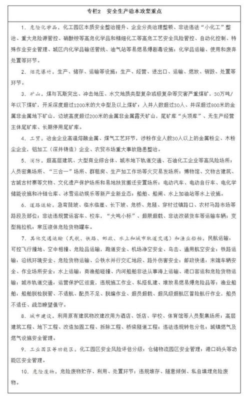 深化專項(xiàng)整治。深入推進(jìn)危險(xiǎn)化學(xué)品、礦山、消防、交通運(yùn)輸、建筑施工、民爆、特種設(shè)備、大型商業(yè)綜合體等重點(diǎn)行業(yè)領(lǐng)域安全整治,解決影響制約安全生產(chǎn)的薄弱環(huán)節(jié)和突出問(wèn)題,督促企業(yè)嚴(yán)格安全管理、加大安全投入、落實(shí)風(fēng)險(xiǎn)管控措施。結(jié)合深化供給側(cè)結(jié)構(gòu)性改革,推動(dòng)安全基礎(chǔ)薄弱、安全保障能力低下且整改后仍不達(dá)標(biāo)的企業(yè)退出市場(chǎng)。統(tǒng)籌考慮危險(xiǎn)化學(xué)品企業(yè)搬遷和項(xiàng)目建設(shè)審批,優(yōu)先保障符合條件企業(yè)的搬遷用地。持續(xù)推進(jìn)企業(yè)安全生產(chǎn)標(biāo)準(zhǔn)化建設(shè),實(shí)現(xiàn)安全管理、操作行為、設(shè)施設(shè)備和作業(yè)環(huán)境規(guī)范化。推動(dòng)淘汰落后技術(shù)、工藝、材料和設(shè)備,加大重點(diǎn)設(shè)施設(shè)備、儀器儀表檢驗(yàn)檢測(cè)力度。推動(dòng)各類金融機(jī)構(gòu)出臺(tái)優(yōu)惠貸款等金融類產(chǎn)品,大力推廣新技術(shù)、新工藝、新材料和新裝備,實(shí)施智能化礦山、智能化工廠、數(shù)字化車間改造,開(kāi)展智能化作業(yè)和危險(xiǎn)崗位機(jī)器人替代示范。強(qiáng)化危險(xiǎn)廢物全過(guò)程監(jiān)管,動(dòng)態(tài)修訂《國(guó)家危險(xiǎn)廢物名錄》,修訂危險(xiǎn)廢物鑒別、貯存以及水泥窯協(xié)同處置污染控制等標(biāo)準(zhǔn),制定完善危險(xiǎn)廢物重點(diǎn)監(jiān)管單位清單。建立廢棄危險(xiǎn)化學(xué)品等危險(xiǎn)廢物監(jiān)管協(xié)作和聯(lián)合執(zhí)法工作機(jī)制,加強(qiáng)危險(xiǎn)廢物監(jiān)管能力與應(yīng)急處置技術(shù)支持能力建設(shè)。
