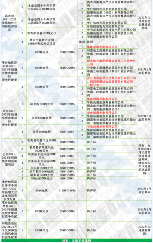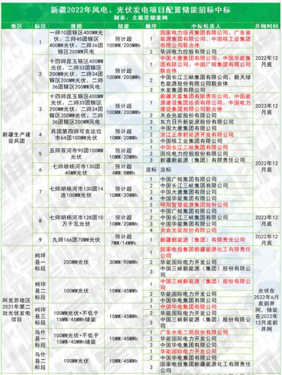 截至目前,新疆各地已啟動(dòng)2022年度新能源發(fā)電竟配項(xiàng)目,其中新疆建設(shè)兵團(tuán)招標(biāo)文件只提出配置儲(chǔ)能、未要求配置比例,其余基本要求按照新能源裝機(jī)量10%~15%配置儲(chǔ)能,儲(chǔ)能時(shí)長(zhǎng)方面阿克蘇地區(qū)要求最高、為3小時(shí),而其他地區(qū)均要求2小時(shí)。若以最低配置比例10%/2h計(jì)算,則新疆2022年新增的風(fēng)電光伏項(xiàng)目配置儲(chǔ)能裝機(jī)量將超過658.5MW/1407MWh,這些儲(chǔ)能項(xiàng)目除了巴州和新疆建設(shè)兵團(tuán)部分項(xiàng)目要求2023年前并網(wǎng)外,其余大多要求2022年6月底或12月底前并網(wǎng),由此可見,新疆2022年底前將新增儲(chǔ)能項(xiàng)目將超過488.5MW/1067MWh。