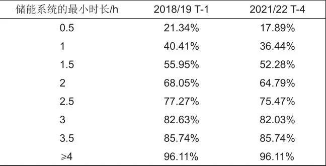 2017年初,部分電力市場(chǎng)參與者提出參與容量市場(chǎng)的電池儲(chǔ)能由于可用時(shí)間短,會(huì)對(duì)電力系統(tǒng)的供應(yīng)安全構(gòu)成風(fēng)險(xiǎn)。之后英國(guó)商務(wù)、能源與工業(yè)戰(zhàn)略部BEIS針對(duì)這一風(fēng)險(xiǎn)進(jìn)行評(píng)估,并在評(píng)估報(bào)告中提出修改儲(chǔ)能的容量降級(jí)因數(shù)(de-rating factor),以此反映不同時(shí)長(zhǎng)儲(chǔ)能系統(tǒng)的容量可用性。2017年12月,英國(guó)商務(wù)、能源與工業(yè)戰(zhàn)略部BEIS和英國(guó)國(guó)家電網(wǎng)發(fā)布報(bào)告,針對(duì)T-4容量拍賣,將時(shí)長(zhǎng)半小時(shí)的電池儲(chǔ)能的降級(jí)因數(shù)從先前設(shè)定的96%降低至17.89%;針對(duì)T-1容量拍賣,將半小時(shí)的電池儲(chǔ)能降級(jí)因數(shù)降低至21.34%。調(diào)整之后的不同時(shí)長(zhǎng)儲(chǔ)能的降級(jí)因數(shù),詳見(jiàn)表1。該規(guī)則的調(diào)整使得儲(chǔ)能的收益受到較大影響,也降低了其在容量市場(chǎng)中的競(jìng)爭(zhēng)力。