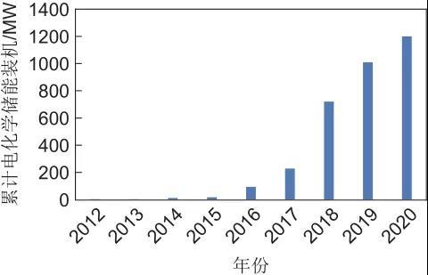 圖1 2012—2020年期間英國(guó)累計(jì)投運(yùn)儲(chǔ)能(不包含抽水蓄能)項(xiàng)目裝機(jī)容量