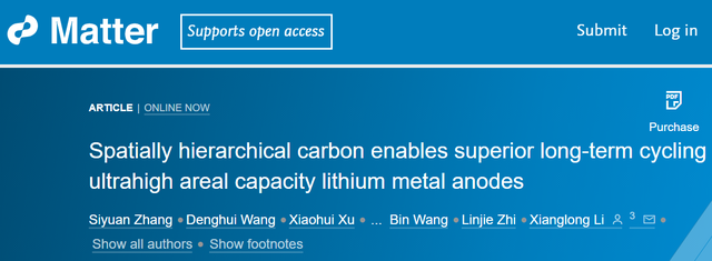 該項(xiàng)工作以“Spatially Hierarchical Carbon Enables Superior Long-Term Cycling of Ultrahigh Areal Capacity Lithium Metal Anodes”為題于2022年2月11日發(fā)表在Matter上,第一作者為國家納米科學(xué)中心博士研究生張思遠(yuǎn),通訊作者是李祥龍研究員。