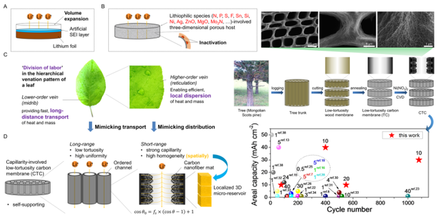 該三維宿主材料模仿葉脈中的“協(xié)作分工”,一方面,低迂曲度碳質(zhì)微溝道不僅可容納充放電過程中的體積變化,還提供長程范圍內(nèi)鋰離子的均勻、直接和快速輸運(yùn)通道;另一方面,均勻覆蓋的碳納米纖維網(wǎng)絡(luò)通過強(qiáng)的毛細(xì)作用提高電解液親和力,從而作為局部儲液池、促進(jìn)鋰離子在短程范圍內(nèi)的均勻分布和沉積。