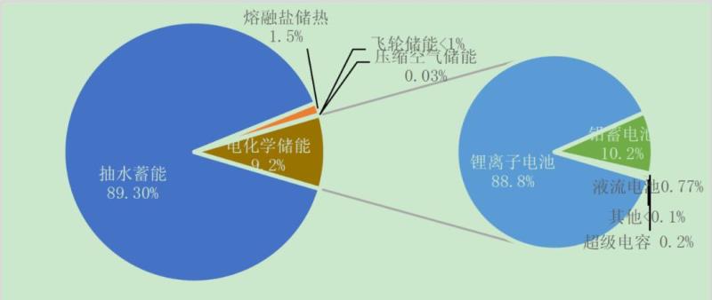截至2020年底,中國已投運(yùn)儲(chǔ)能項(xiàng)目累計(jì)裝機(jī)規(guī)模占全球市場(chǎng)總規(guī)模的18.6%。其中規(guī)模最大的是抽水蓄能,電化學(xué)儲(chǔ)能位列第二,各類電化學(xué)儲(chǔ)能技術(shù)中規(guī)模最大的是鋰離子電池。
