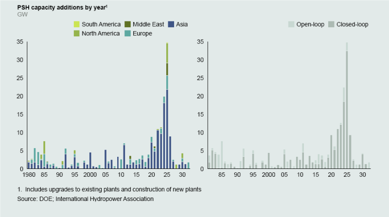 大型抽水蓄能發(fā)電設(shè)施可以提供低成本、可調(diào)度的電力,并且由于其快速響應(yīng)時(shí)間而作為電網(wǎng)穩(wěn)定性的主要解決方案。它的主要限制是缺乏可用場(chǎng)地、交貨時(shí)間長(zhǎng)、建設(shè)成本高以及環(huán)境問(wèn)題。盡管如此,它仍有潛力滿足日益增長(zhǎng)的電氣化需求和對(duì)零碳能源的需求,并促進(jìn)難以減排的行業(yè)脫碳,特別是在擁有大部分未開(kāi)發(fā)自然潛力且電力需求可能成倍增加的新興經(jīng)濟(jì)體中。