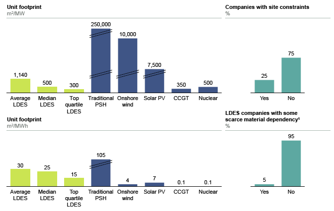 大多數(shù)新興的長(zhǎng)時(shí)儲(chǔ)能技術(shù)幾乎沒(méi)有部署限制(如圖8所示)。例如,這些長(zhǎng)時(shí)儲(chǔ)能系統(tǒng)沒(méi)有特定的地理位置要求,并且每個(gè)裝機(jī)容量的占地面積較小。根據(jù)長(zhǎng)時(shí)儲(chǔ)能技術(shù)的不同特點(diǎn),有些長(zhǎng)時(shí)儲(chǔ)能系統(tǒng)可以建在地下或非??拷丝诔砻艿牡貐^(qū),因?yàn)樗鼈兊陌踩L(fēng)險(xiǎn)低。
