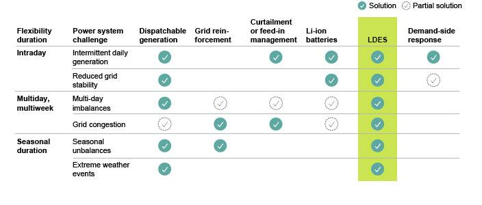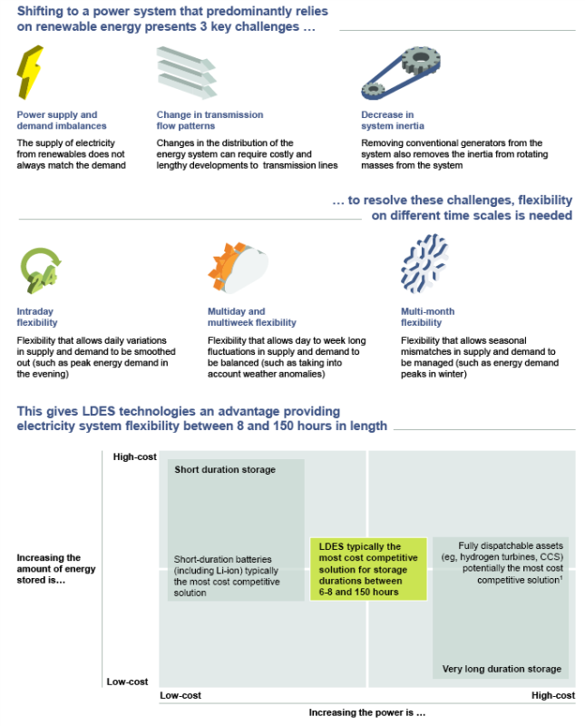 持續(xù)時(shí)間將從12小時(shí)延伸到持續(xù)數(shù)天或數(shù)周。需要解決長(zhǎng)期不平衡的可再生能源輸出或由輸電限制引起的潛在中斷。傳統(tǒng)上,電力系統(tǒng)依賴于傳統(tǒng)發(fā)電廠、電力供應(yīng)縮減和輸電網(wǎng)規(guī)模的擴(kuò)張。長(zhǎng)時(shí)儲(chǔ)能技術(shù)是一種有前途的零碳解決方案,可以滿足這些長(zhǎng)期靈活性需求,尤其是那些持續(xù)數(shù)天的電力需求。