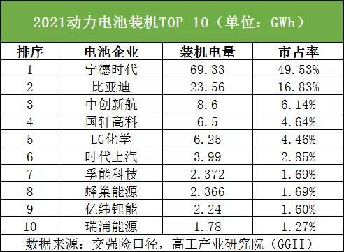 其中,寧德時代2021年動力電池裝機量69.33GWh,同比增長132%,國內(nèi)市場占有率達到49.53%,領先第二名比亞迪市占率超32%。