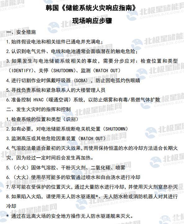 北極星儲(chǔ)能網(wǎng)了解到,2月7日韓國(guó)消防部發(fā)布了《儲(chǔ)能系統(tǒng)火災(zāi)響應(yīng)指南》,文件指出儲(chǔ)能系統(tǒng)起火和爆炸的主要原因是電池產(chǎn)生的可燃?xì)怏w,而在儲(chǔ)能系統(tǒng)起火時(shí)防止產(chǎn)生可燃?xì)怏w的最佳方法是冷卻電池,該響應(yīng)指南針對(duì)不同的火災(zāi)程度給出了處置建議。
