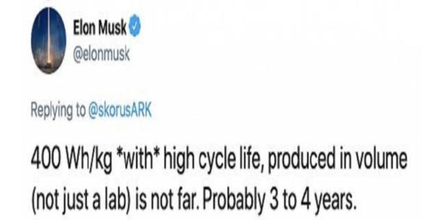 在2020年8月的特斯拉電池日之前,馬斯克在推特上表示特斯拉會在3-4年內(nèi)批量生產(chǎn)壽命更長、而且能量密度提高50%也就是達到400wh/kg的電池,當時Model 3使用的松下 2170 電池電芯能量密度為260wh/kg。