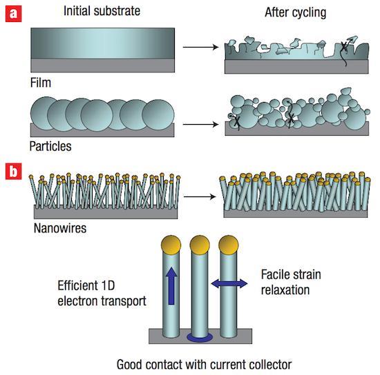 2007年,時為斯坦福材料科學與工程系助理教授的崔屹在Nature Nanotechnology上發(fā)布了一篇題為《使用硅納米線的高性能鋰電池負極(High-performance lithium battery anodes using silicon nanowires)》的論文,詳細闡釋了硅納米線技術(shù)在鋰電池中的應用。