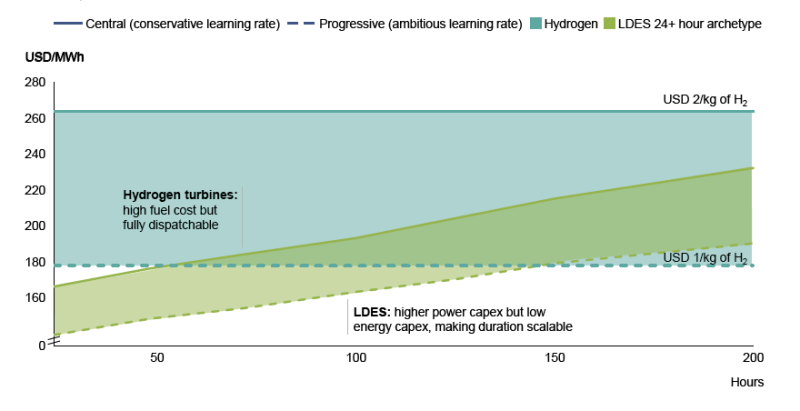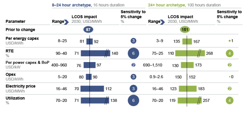 ?到2030年,持續(xù)時(shí)間150小時(shí)的長(zhǎng)時(shí)儲(chǔ)能可以與相同規(guī)模的氫能設(shè)施在平準(zhǔn)化成本(LCOS)方面進(jìn)行競(jìng)爭(zhēng)。