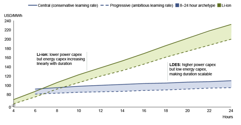 ?到2030年,持續(xù)時(shí)間6小時(shí)以上的長(zhǎng)時(shí)儲(chǔ)能可以與鋰離子電池儲(chǔ)能系統(tǒng)在平準(zhǔn)化成本(LCOS)方面進(jìn)行競(jìng)爭(zhēng),而在持續(xù)時(shí)間9小時(shí)以上的儲(chǔ)能應(yīng)用中具有明顯的優(yōu)勢(shì)。