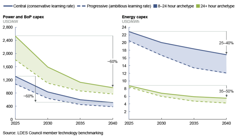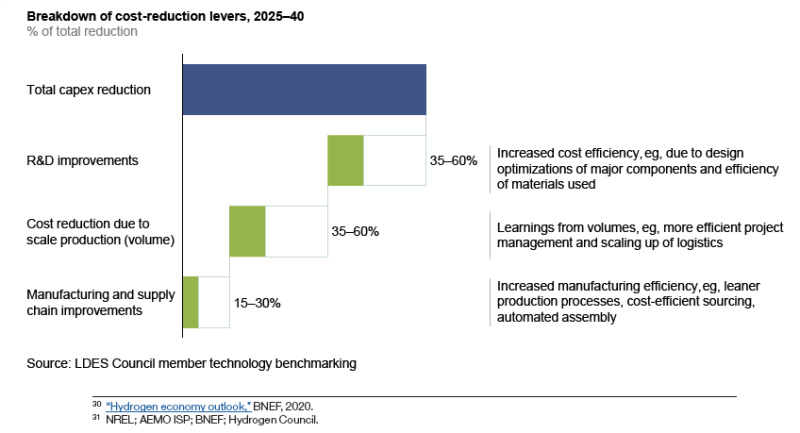 長(zhǎng)時(shí)儲(chǔ)能系統(tǒng)資本支出的預(yù)測(cè)(到2040年減少55%至60%的成本)與公用事業(yè)規(guī)模鋰離子電池儲(chǔ)能系統(tǒng)(降低約70%)和氫能設(shè)施(降低約50%)報(bào)告的預(yù)期相當(dāng)。
