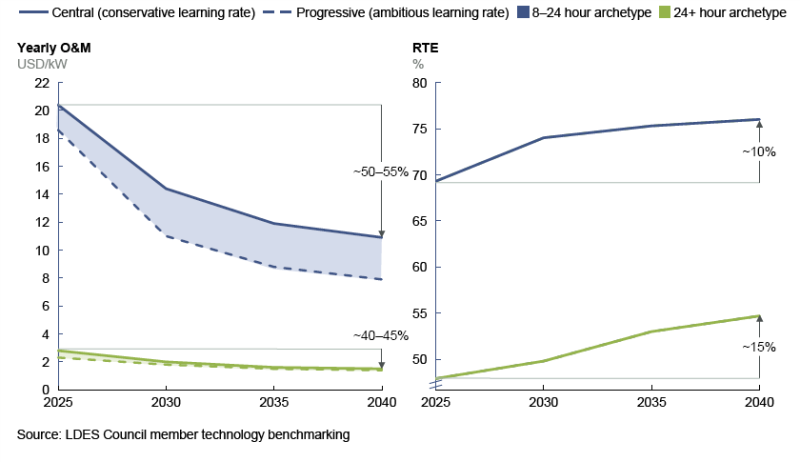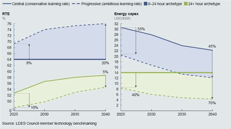 長(zhǎng)時(shí)儲(chǔ)能的競(jìng)爭(zhēng)力主要由儲(chǔ)能容量的成本驅(qū)動(dòng),預(yù)計(jì)其成本將下降60%。這些長(zhǎng)時(shí)儲(chǔ)能技術(shù)的充放電往返效率(RTE)預(yù)計(jì)也將提高10%至15%。