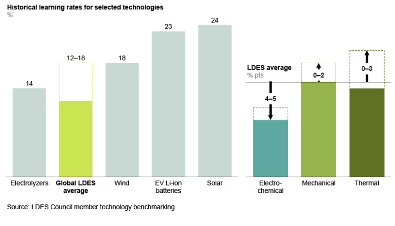 長(zhǎng)時(shí)儲(chǔ)能通常都是新興技術(shù),隨著部署規(guī)模的擴(kuò)大,將會(huì)降低成本。長(zhǎng)時(shí)儲(chǔ)能委員會(huì)表示,長(zhǎng)時(shí)儲(chǔ)能資本支出的成本下降曲線在12%到18%之間,并與海上風(fēng)能和電池等其他類似的突破性能源技術(shù)一致。技術(shù)發(fā)展和擴(kuò)大運(yùn)營(yíng)規(guī)模將是成本改善的最大驅(qū)動(dòng)力。