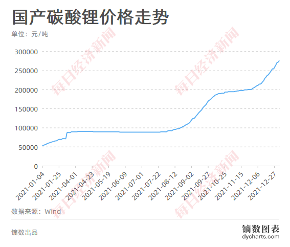 Wind數(shù)據(jù)顯示,2021年1月4日國產(chǎn)碳酸鋰市場均價為5.3萬元/噸,到了2021年12月31日,這一價格漲到了27.5萬元/噸,一年時間內(nèi),價格漲幅已經(jīng)超過4倍。