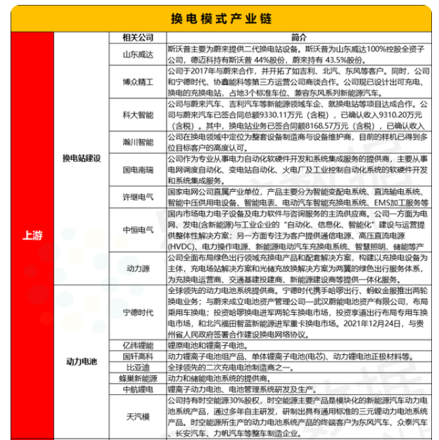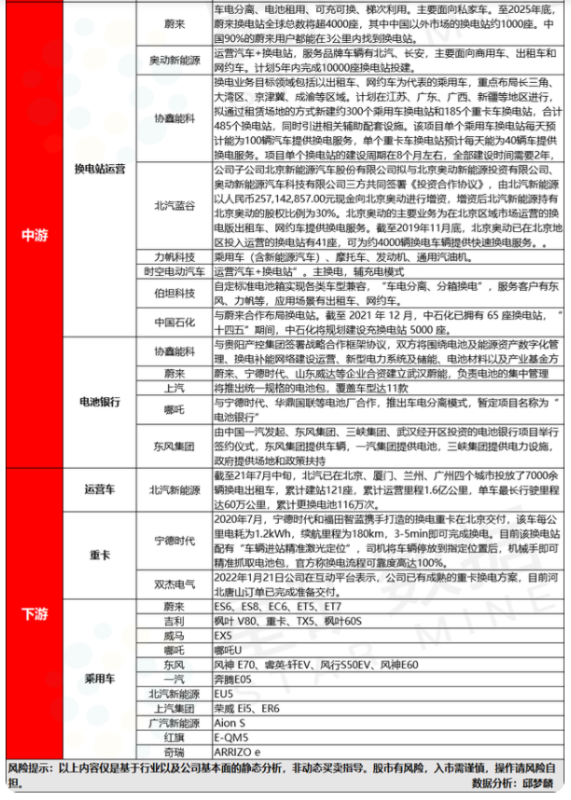 換電站產(chǎn)業(yè)鏈的上游為換電站建設(shè),主要包括基礎(chǔ)零部件、換電系統(tǒng)、充電系統(tǒng)和動(dòng)力電池。中游主要是換電站的運(yùn)營(yíng),主要參與者是主機(jī)整車(chē)商、運(yùn)營(yíng)商、電池資產(chǎn)管理公司(電池銀行)和電池回收,梯次應(yīng)用;下游面對(duì)的是換電站的使用者,劃分為T(mén)o B公交車(chē)、出租車(chē)、網(wǎng)約車(chē)、重卡;以及To C的乘用車(chē)。