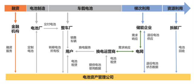 金融機(jī)構(gòu)提供融資方案;電池供應(yīng)商和整車(chē)廠、換電運(yùn)營(yíng)商之間通過(guò)定制和租/購(gòu)?fù)瓿呻姵亟桓?,以及電池?cái)?shù)據(jù)交換完成統(tǒng)一管理,排除安全隱患;