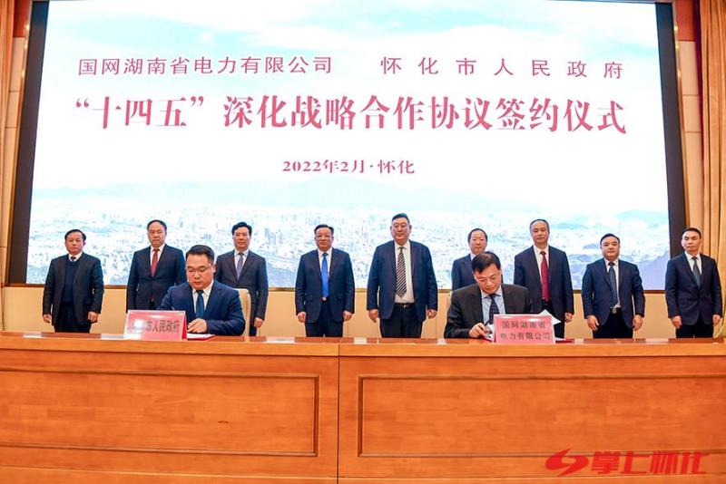 中國儲(chǔ)能網(wǎng)訊:飛雪迎春到,歲寒情更濃。2月22日下午,懷化市政府與國網(wǎng)湖南省電力有限公司簽署“十四五”深化戰(zhàn)略合作協(xié)議。市委書記雷紹業(yè),國網(wǎng)湖南省電力有限公司董事長、黨委書記孟慶強(qiáng)共同見證簽約,市委副書記、市長黎春秋主持,國網(wǎng)湖南省電力有限公司總經(jīng)理、黨委副書記明煦,市領(lǐng)導(dǎo)李衛(wèi)林、鄒興旺出席簽約儀式。