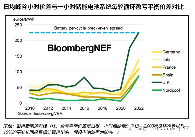價差一直在上升,目前在部分市場已經(jīng)接近對儲能電池系統(tǒng)具有吸引力的水平。歐洲主要電力市場的日前套利價差已經(jīng)大幅擴(kuò)大,特別是在英國市場。自2020年至2022年,日均峰谷小時價差增長四倍,從25歐元/MWh升至126歐元/MWh。英國價差擴(kuò)大幅度最大,2021年均值為177歐元/MWh,而2022年迄今為止的均值為225歐元/MWh,高于2010-2020年51歐元/MWh的長期平均值。