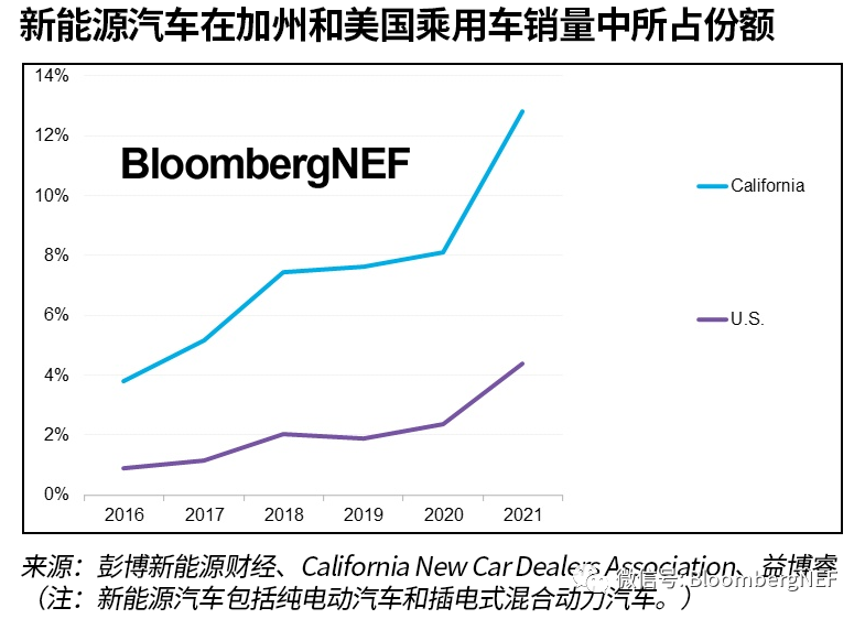 該州在2020年秋季設定了于2035年淘汰內(nèi)燃機(ICE)汽車的目標。彭博新能源財經(jīng)當時預計,為保證按規(guī)劃淘汰內(nèi)燃機汽車,加州2021年新能源汽車銷售份額須達到10%左右。車企最初對2035年目標持猶豫態(tài)度,但之后一些公司已設定了自己的內(nèi)燃機淘汰目標,值得一提的是通用汽車公司、福特汽車、大眾汽車和本田汽車。