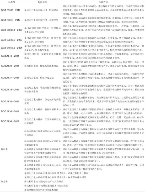 表3 梯次利用相關(guān)標(biāo)準(zhǔn)