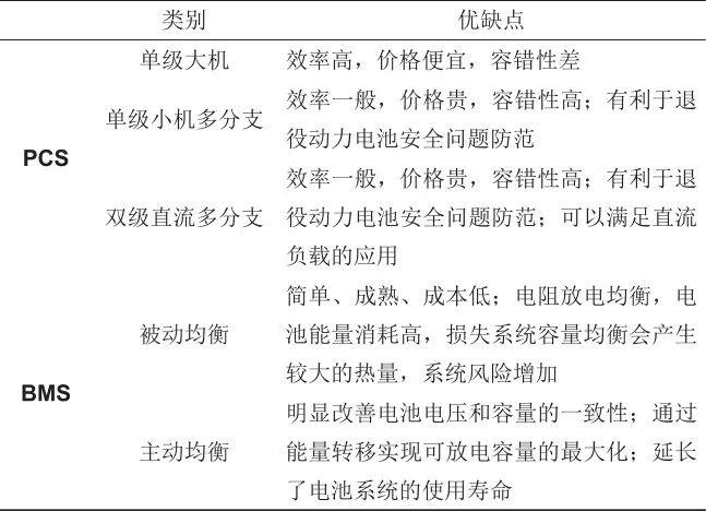 常規(guī)PCS和BMS被動(dòng)均衡無(wú)法解決退役動(dòng)力電池運(yùn)行過(guò)程一致性發(fā)散的問題,導(dǎo)致模塊利用率低。需要采用退役電池的專用拓?fù)浣Y(jié)構(gòu)和BMS均衡策略,例如單雙級(jí)混合式拓?fù)?、直流多分支兩?jí)拓?fù)洹MS主動(dòng)均衡等,防范和抑制退役動(dòng)力電池安全問題,PCS與BMS設(shè)備類型對(duì)比,見表2。