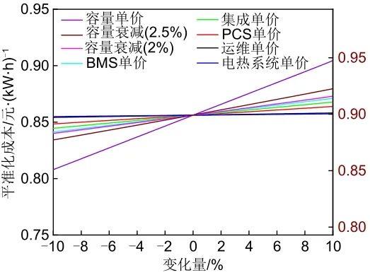 在表1所列的參數(shù)下,梯次儲(chǔ)能平準(zhǔn)化成本參數(shù)的敏感性如圖1所示,容量衰減為2.5%的平準(zhǔn)化成本以右軸數(shù)據(jù)為準(zhǔn),其余以左軸數(shù)據(jù)為準(zhǔn)。平準(zhǔn)化成本受退役電池單價(jià)、容量衰減率影響較大。