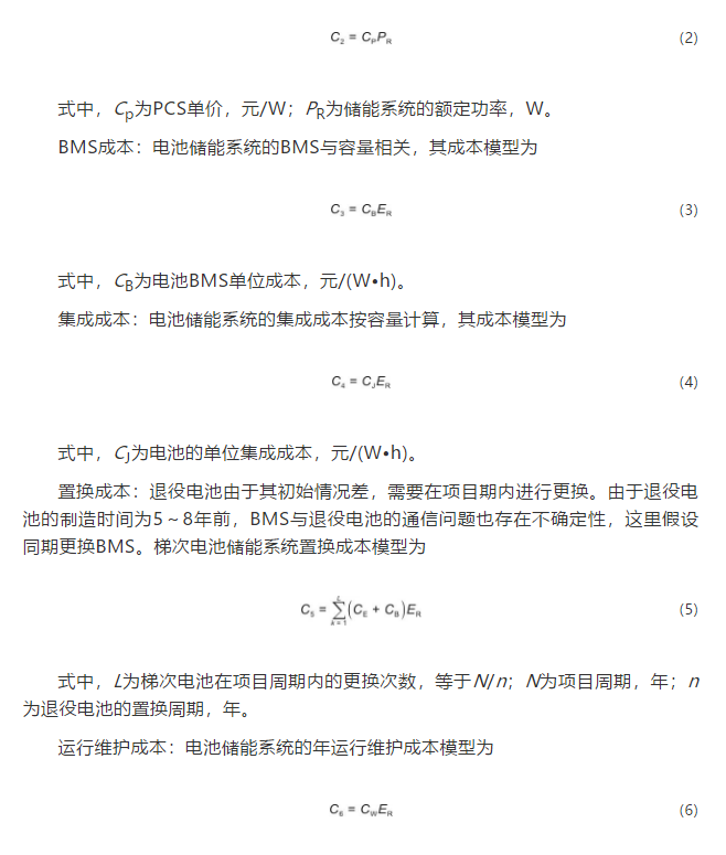 梯次儲(chǔ)能系統(tǒng)的成本通常包含電池成本、功率變換器成本(power conversion system,PCS)、電池管理系統(tǒng)成本(battery management system,BMS)、集成成本、置換成本、運(yùn)行維護(hù)成本、冷卻系統(tǒng)成本以及電熱安全成本、殘值。