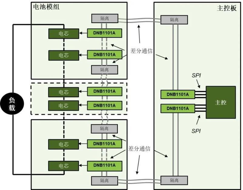 DNB1101A為每個(gè)單獨(dú)的電芯或并聯(lián)的一組電芯提供多種傳感功能,包括電壓監(jiān)測、溫度監(jiān)測和電化學(xué)阻抗譜(EIS)監(jiān)測。通過差分菊花鏈,電池參數(shù)信息被傳輸?shù)诫姵亟M控制器。鏈中的第一顆芯片將標(biāo)準(zhǔn)SPI信號轉(zhuǎn)換為菊花鏈差分信號,反之亦然。芯片支持環(huán)形通信架構(gòu)。