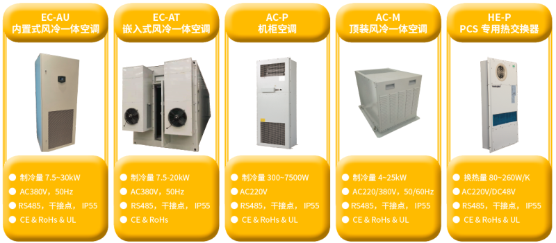2017年起,黑盾股份開始為儲能系統(tǒng)提供風冷溫濕度解決方案,針對儲能電池和PCS的發(fā)熱特點和運行要求,先后研發(fā)了儲能集裝箱專用的一體式風冷空調和熱交換器,產品根據不同儲能集裝箱的設計要求,分為內置一體式、嵌入一體式、頂置式等不同系列產品,受到客戶廣泛認可。