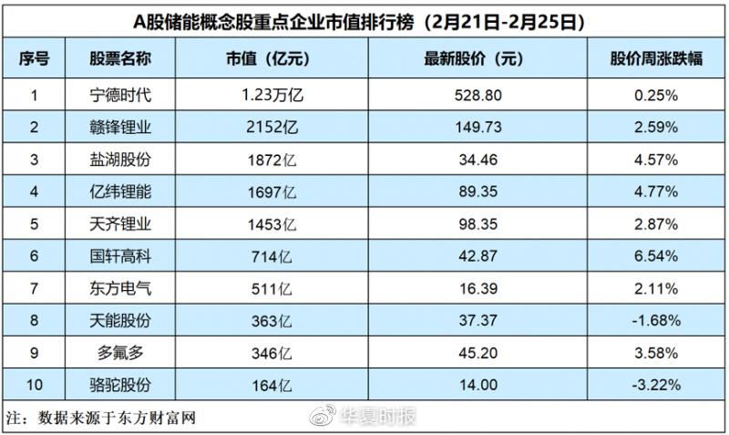 中國(guó)儲(chǔ)能網(wǎng)訊:本周(2月21日-2月25日)東方財(cái)富儲(chǔ)能概念板塊整體上漲2.57%?!度A夏時(shí)報(bào)》記者重點(diǎn)監(jiān)測(cè)的10家儲(chǔ)能企業(yè),除駱駝股份、天能股份兩家下跌外,其余全部收漲。