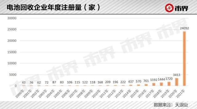 天眼查數(shù)據(jù)顯示,2011年,即第一批電動汽車投放市場的那一年,與電池回收相關(guān)的企業(yè)注冊量首次突破200家,2017年首次突破1000家。