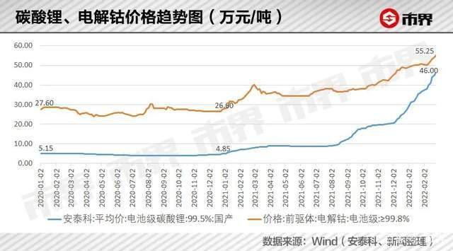 Wind數(shù)據(jù)顯示,電池級碳酸鋰價格已經(jīng)從2021年初近5萬元/噸漲至2022年2月24日的46萬元/噸,電解鈷價格則從27萬元/噸增至55.25萬元/噸。
