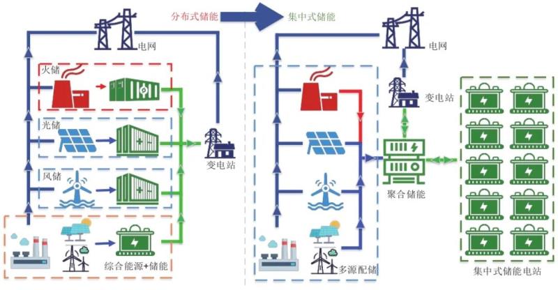 雙碳目標理念引領(lǐng)著新能源行業(yè)大規(guī)模滲透到電力系統(tǒng),而新能源電站配備儲能電站已經(jīng)是行業(yè)共識和實際需要。國家能源局也在大力推崇一站式綜合能源示范園區(qū),儲能系統(tǒng)也成為風光荷電儲中的重要一環(huán)?!皟δ?”發(fā)展理念應(yīng)運而生,“儲能+傳統(tǒng)發(fā)電”改善機組性能,提高負荷需求響應(yīng)速度;“儲能+新能源發(fā)電”減少了棄光棄風現(xiàn)象,提高新能源利用效率,平緩過渡;“儲能+電網(wǎng)”減少區(qū)域控制誤差,削弱新能源并網(wǎng)影響;“儲能+用戶”降低用電成本。因此,儲能的發(fā)展勢必呈現(xiàn)集中式服務(wù)和分布式服務(wù)的情形,如圖1所示。電力系統(tǒng)常在火電、風電、光伏、綜合能源園區(qū)等領(lǐng)域配備一定容量的儲能,一般而言,各儲能系統(tǒng)作為獨立個體只服務(wù)所配套設(shè)施。若發(fā)電設(shè)備發(fā)生停機維護或未中標低負荷運行時,儲能設(shè)備則處于閑置或半閑置狀態(tài),尤其是太過依賴于外界因素的新能源經(jīng)常發(fā)生擺停、假停等現(xiàn)象,從而造成儲能閑置率較高,設(shè)備資源利用率低下。當分布式儲能的裝機容量在電力系統(tǒng)中占據(jù)一定比重時,無形增加了發(fā)電成本,且使用效率低下,無法充分發(fā)揮儲能的潛力作用。若將分布式儲能通過某種聚攏技術(shù)進行聯(lián)合調(diào)控,閑置儲能將得到合理利用,存儲局部電網(wǎng)調(diào)節(jié)余量,打破各個傳統(tǒng)儲能系統(tǒng)之間壁壘,有助于電網(wǎng)和發(fā)電行業(yè)進行聯(lián)合運行調(diào)控,提高電能品質(zhì)和儲能系統(tǒng)利用率。