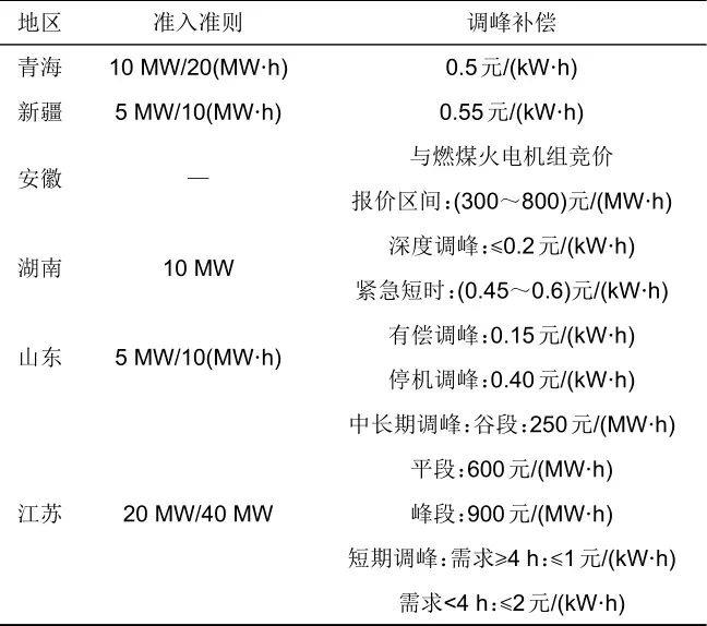 表2 典型地區(qū)儲能參與調(diào)峰補償標準