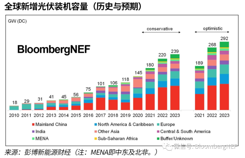 我們目前預(yù)計2021年新增的光伏裝機(jī)容量達(dá)到184GW(直流側(cè)),該數(shù)值在2022年將上升至245GW(直流側(cè)),創(chuàng)下新紀(jì)錄。
