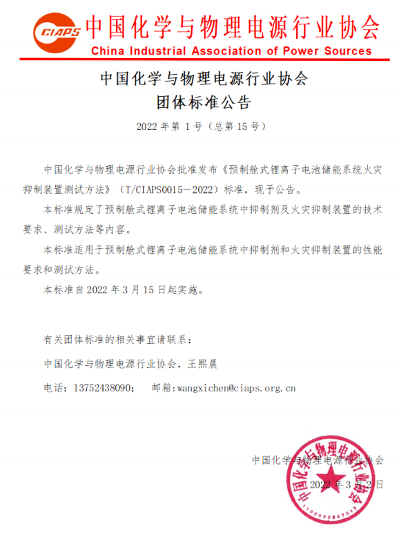 中國(guó)化學(xué)與物理電源行業(yè)協(xié)會(huì)批準(zhǔn)發(fā)布《預(yù)制艙式鋰離子電池儲(chǔ)能系統(tǒng)火災(zāi)抑制裝置測(cè)試方法》(T/CIAPS0015―2022)標(biāo)準(zhǔn),現(xiàn)予公告。