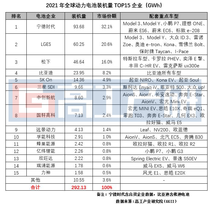 其中,TOP 15動力電池企業(yè)共裝機(jī)281.58GWh,占整體裝機(jī)電量的96%。依次為寧德時代、LGES、松下、比亞迪、SK ON、三星SDI、中創(chuàng)新航、國軒高科、遠(yuǎn)景動力、孚能科技、蜂巢能源、億緯鋰能、欣旺達(dá)、瑞浦能源。