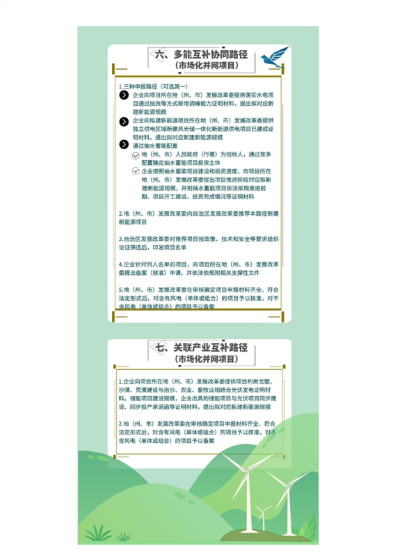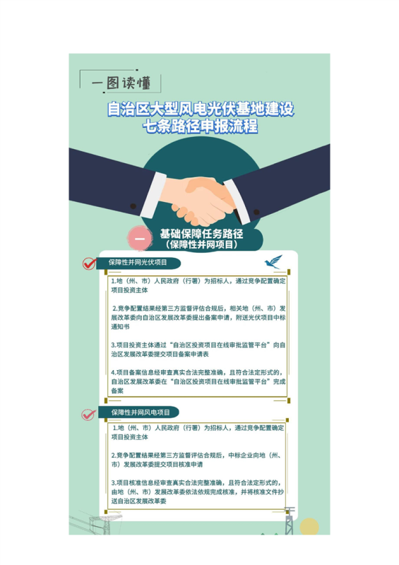 二是第(一)條路徑中項目為保障性并網(wǎng)項目,光伏(向大電網(wǎng)送電)項目由自治區(qū)發(fā)展改革委備案,風(fēng)電項目由地(州、市)發(fā)展改革委核準(zhǔn);第(二)(三)(四)(五)(六)條路徑中項目,為通過源網(wǎng)荷儲一體化、多能互補等方式建設(shè)的市場化并網(wǎng)項目。根據(jù)《國家發(fā)展改革委 國家能源局關(guān)于完善能源綠色低碳轉(zhuǎn)型體制機制和政策措施的意見》(發(fā)改能源〔2022〕206號)中“深化能源領(lǐng)域‘放管服’改革,優(yōu)化清潔低碳能源項目核準(zhǔn)和備案流程”精神,自治區(qū)發(fā)展改革委經(jīng)組織國家能源局新疆監(jiān)管辦、自治區(qū)自然資源廳、生態(tài)環(huán)保廳、國網(wǎng)新疆電力有限公司等相關(guān)部門和單位,按政策、技術(shù)和安全等要求論證,將符合要求的項目列入自治區(qū)項目名單后,統(tǒng)一由地(州、市)發(fā)展改革委核準(zhǔn)(備案);第(七)條路徑中項目為市場化并網(wǎng)項目,由各地(州、市)發(fā)展改革委核準(zhǔn)(備案)。