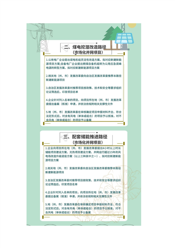 溫馨提示:通過煤電挖潛改造路徑建設(shè)新能源項目的,投資主體應(yīng)為實施煤電機組靈活性改造、自備機組轉(zhuǎn)為公用應(yīng)急調(diào)峰電源的企業(yè),不得轉(zhuǎn)讓新能源建設(shè)規(guī)模。申報配建新能源項目前,企業(yè)需提出煤電機組靈活性改造方案,自治區(qū)發(fā)展改革委結(jié)合國網(wǎng)年度機組檢修安排,開展靈活性改造方案評估,印發(fā)煤電機組靈活性改造計劃?;蚱髽I(yè)提出燃煤自備機組轉(zhuǎn)為公用應(yīng)急調(diào)峰電源的轉(zhuǎn)型方案,明確轉(zhuǎn)為公用電源的時間、電網(wǎng)接入方式等事項,自治區(qū)發(fā)展改革委會商國網(wǎng)新疆電力公司,確認(rèn)轉(zhuǎn)型方案。
